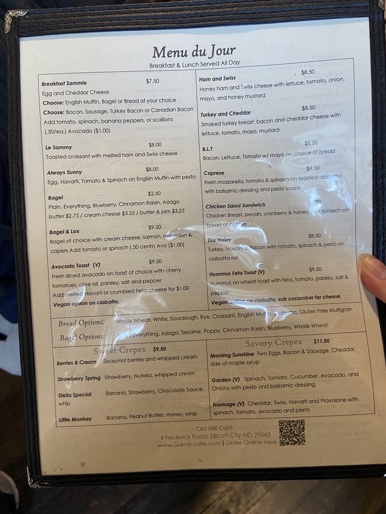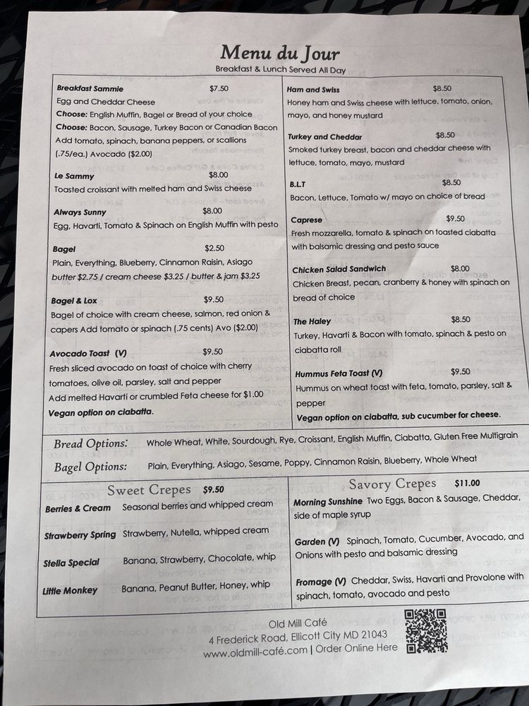 Welcome to Old Mill Cafe, a charming breakfast and brunch destination nestled in historic Ellicott City, MD. This inviting cafe delights patrons with a diverse menu that showcases both savory and sweet crepes, hearty sandwiches, and freshly baked pastries. Each dish is crafted with quality ingredients, offering options that please every palate.